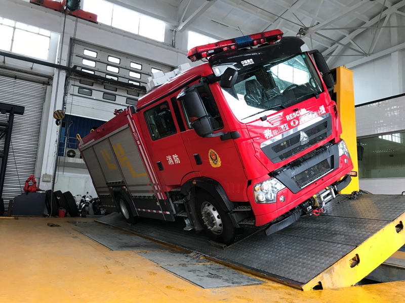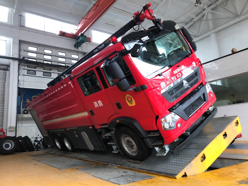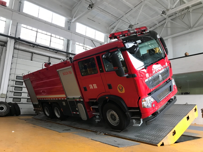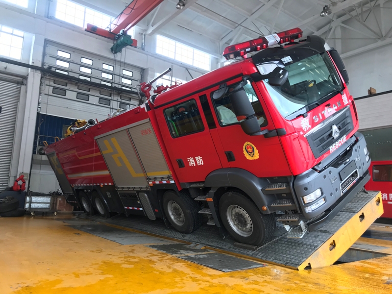 車輛底盤為ZZ5207TXFV471GF5底盤,發動機型號MC07H.35-60,功率為257kw,國六排放標準,軸距4500mm,罐體材質采用采用優質304不銹鋼板,容罐容量:水3600kg+B類泡沫900kg+A類泡沫200kg;消防泵為KSP1000(美國大力);壓縮空氣泡沫系統:品牌:美國大力,型號:KSPBC1000/220型,型式:全自動集成式壓縮空氣A類泡沫系統,消防炮為PLKD48手動及電控,升降照明系統YZH6-4.83CFA,牽引絞盤系統為杭州天銘FHW16500 整車器材箱卷簾門防水槽采用專用鋁合金開模型材,型材上加裝LED照明燈帶,使整車形成環繞式照明,既美觀且照明效果又好。器材箱卷簾門下部翻轉踏板,采用一體式鋁合金擠壓型材,模塊化組裝,增加了整車的品質。箱體內部器材框架采取了專用的的擋板型材,有效的保證了內部器材固定的穩定性,同時使器材標牌整齊化一,清晰明了。壓縮空氣系統采用美國大力集成式系統,結構緊湊、性能優良、操作簡便統一空間利用率高。空壓機流量為國內目前CAFS系統中最大流量,可達105L/S,更好地滿足于壓縮空氣泡沫系統性能需求。
